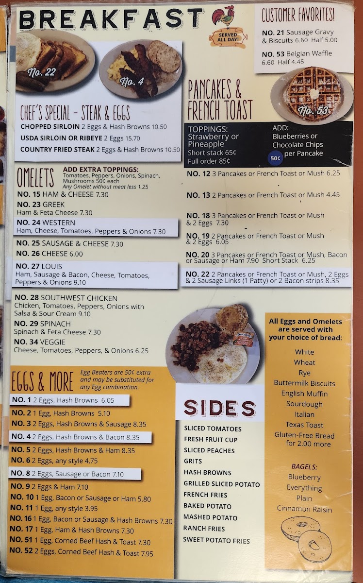 2 eggs prepared your way from 16 options, including omelet style and poached. Choice of bacon, sausage, or ham from 6 varieties. Accompanied by a breakfast side and choice of bread from 15 types.