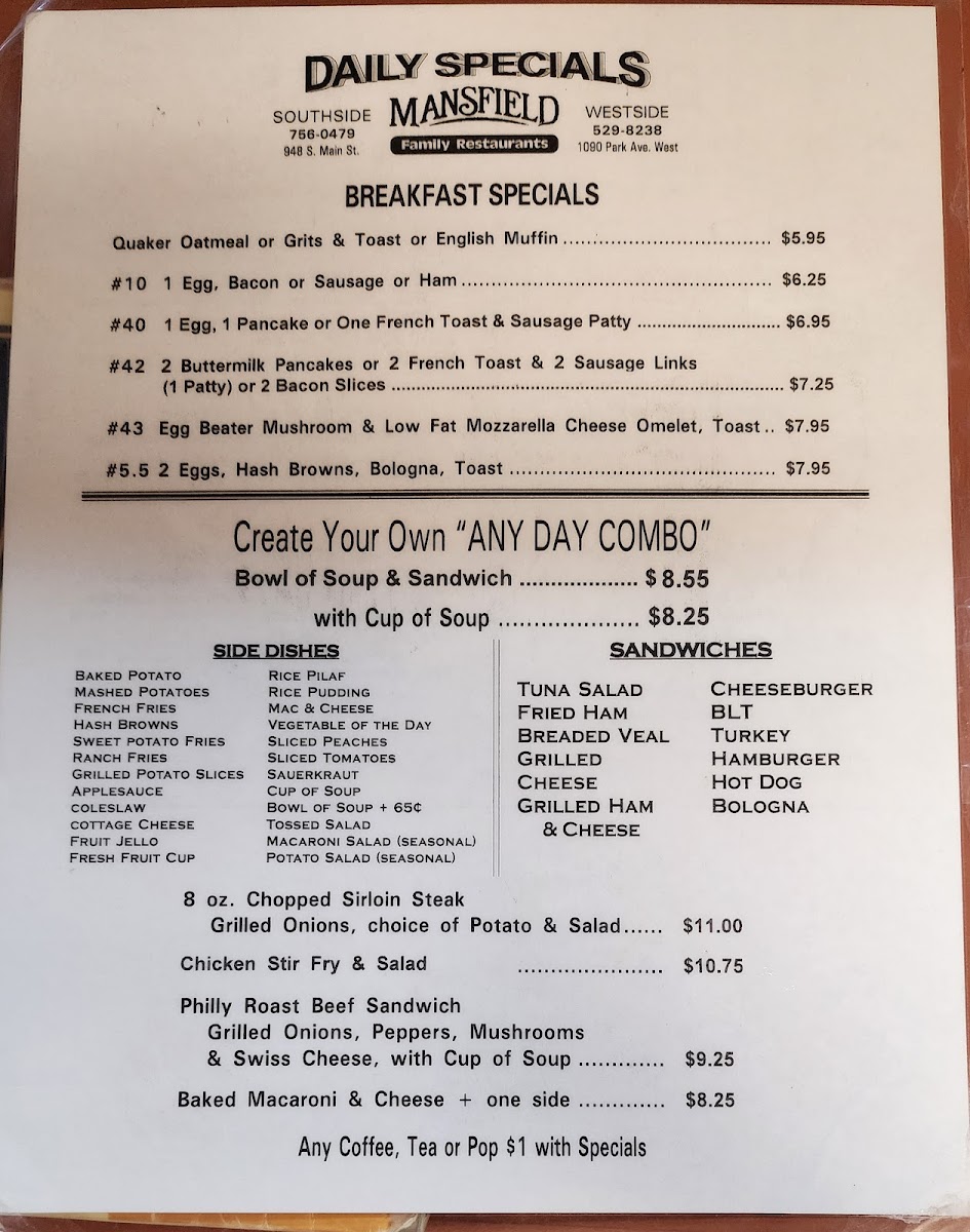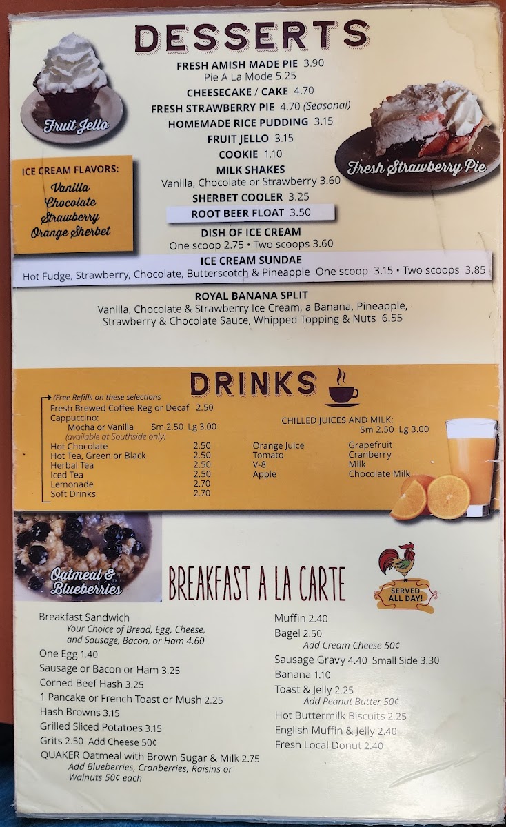 Cappuccino available in small or large; mocha or vanilla. Free refills.