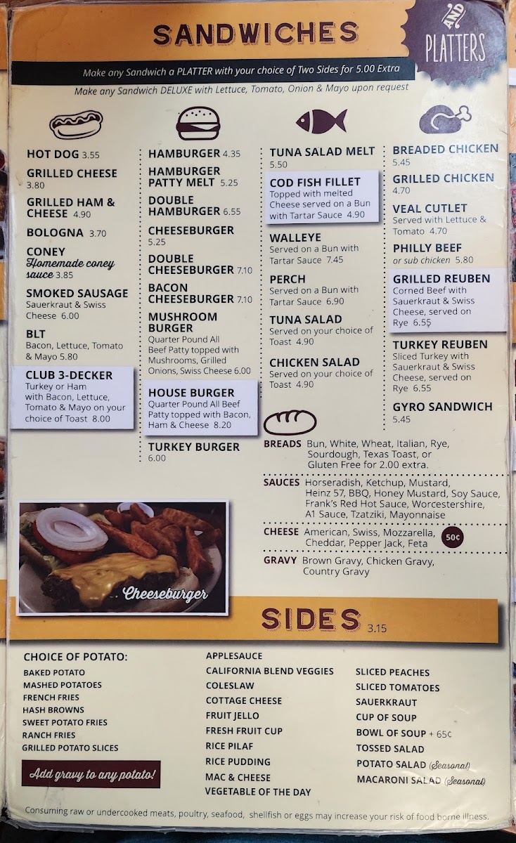 1 egg prepared to preference: basted to sunny side up. Choice of bacon, sausage, or ham. Accompanied by a breakfast side and bread variety, from white to gluten-free.