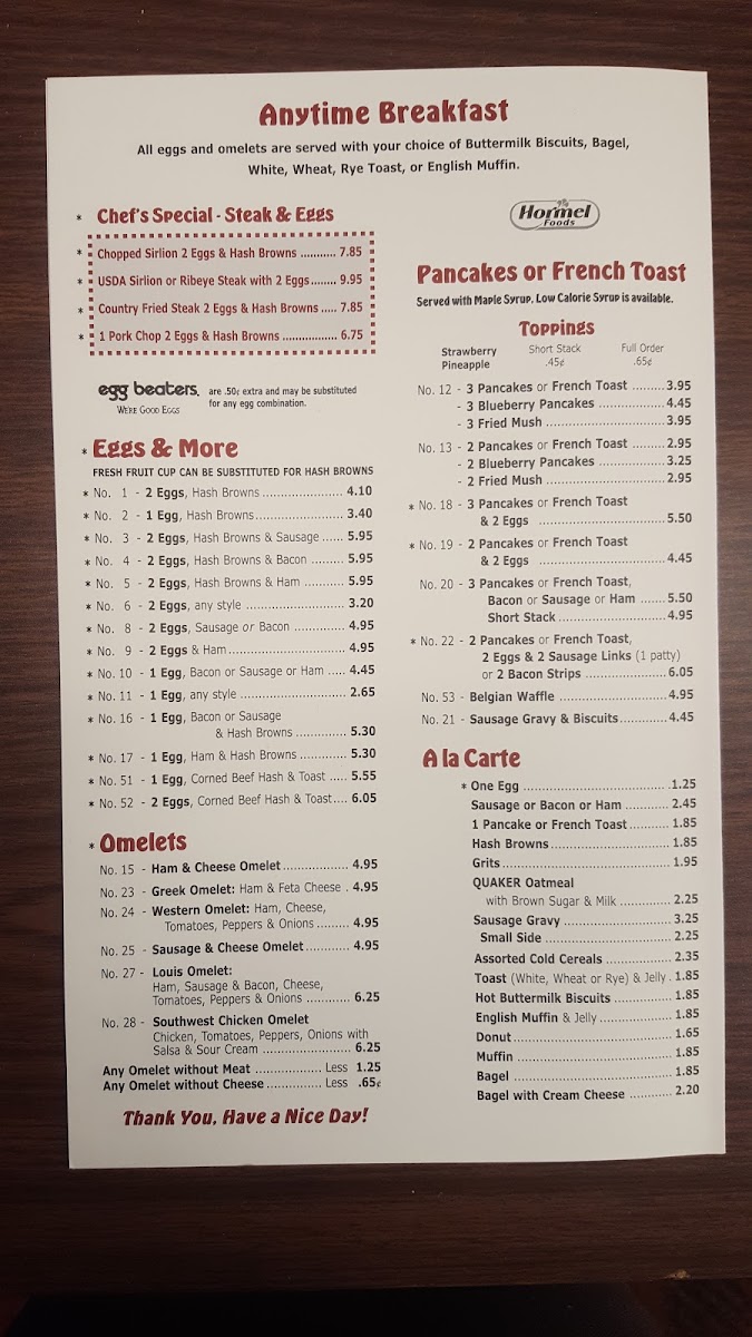 1 egg with a choice of ham or five other meat options, served with a variety of sides and egg styles. Breakfast bread selection available.